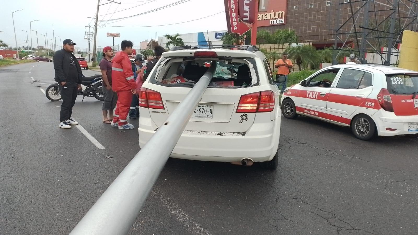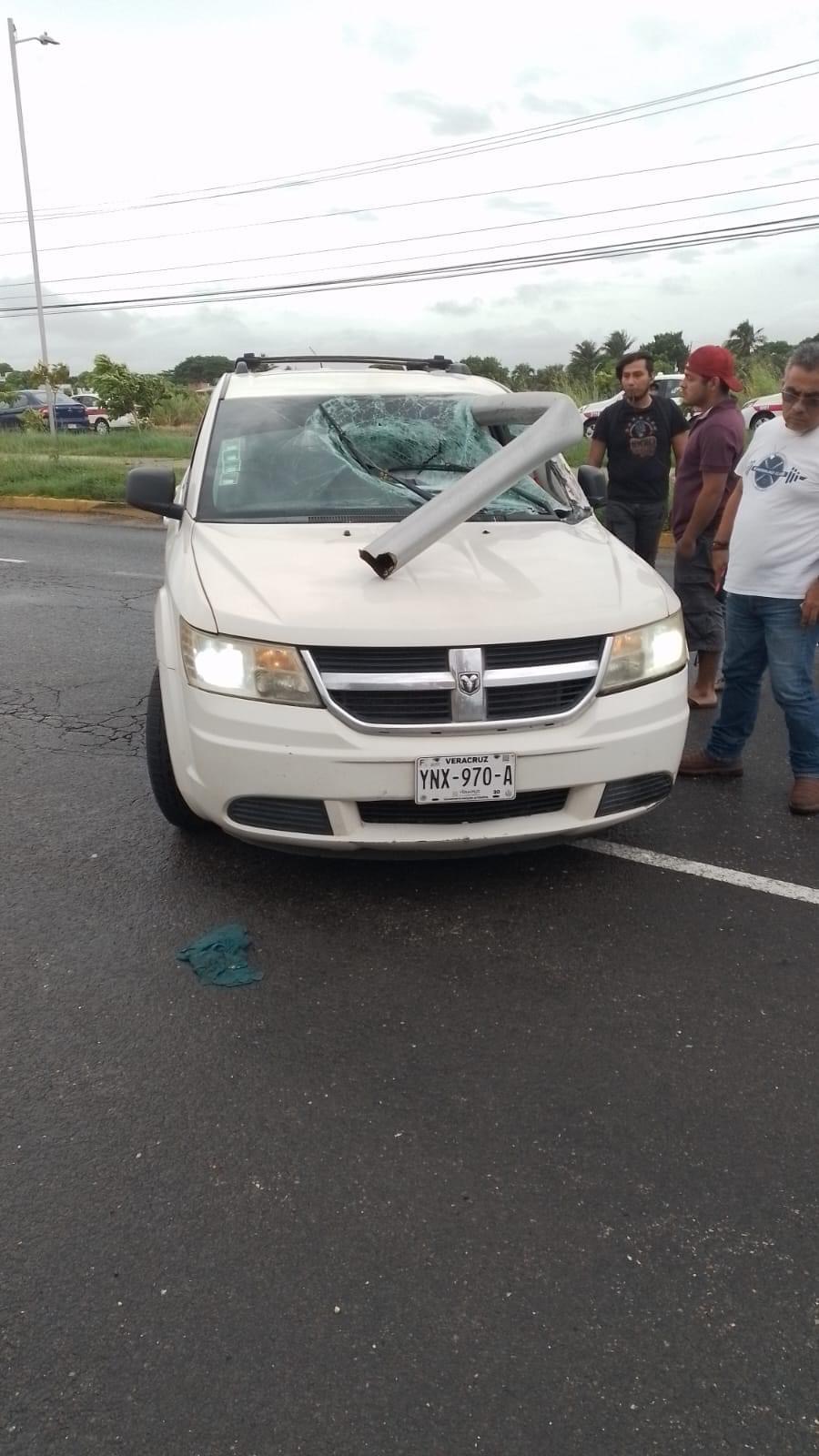 Los fuertes vientos que son ocasionados por el paso del frente frío número 6 originaron la caída de un poste que se desprendió de su base, y desafortunadamente atravesó la camioneta Dodge Journey, de color blanco, en que se dirigia esta persona hacia su casa.