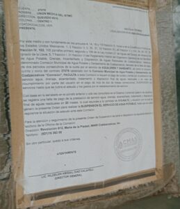 En la entrada principal del establecimiento se colocó un oficio que detalla la situación y fundamenta la acción legal. El documento señala la falta de pago de la cuota por el servicio de agua, drenaje y saneamiento por un periodo extenso.