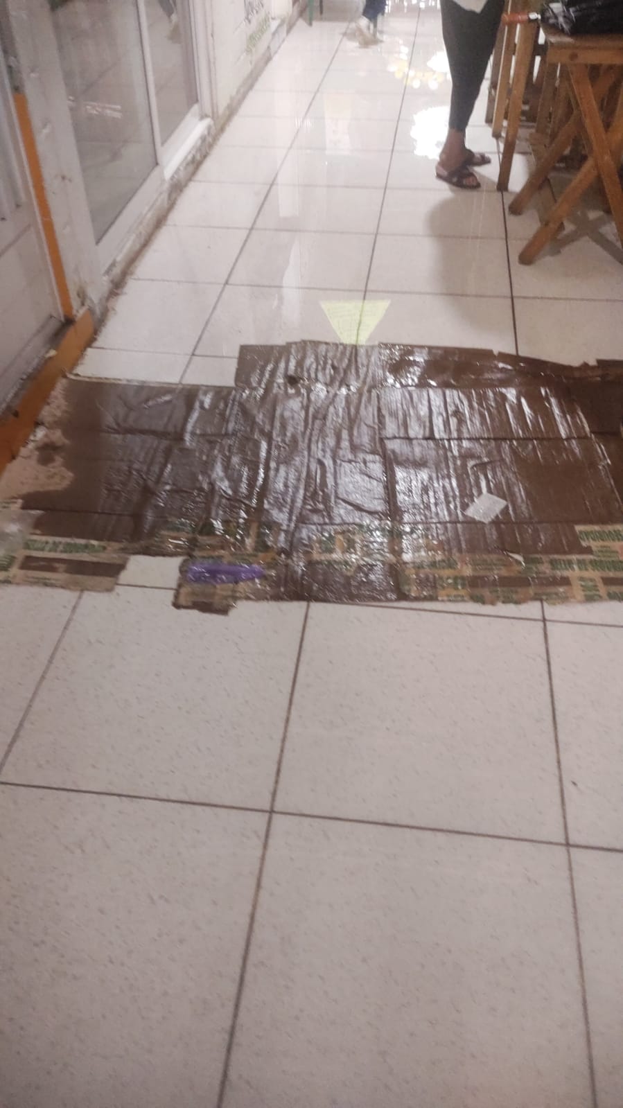 Para aminorar las filtraciones y encharcamientos dentro del lugar, improvisaron una especie de canaleta con las láminas rotas para evitar que los pasillos estén llenos de agua.
