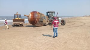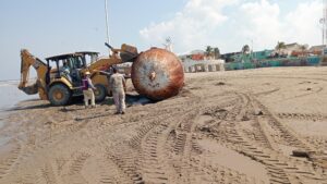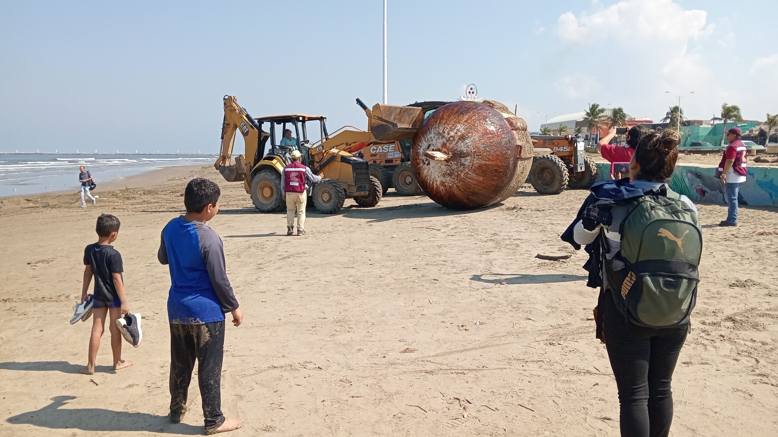 De acuerdo con autoridades municipales, la boya corresponde a una estructura utilizada en trabajos marítimos, como dragado o señalización, y fue desplazada por la intensidad del mar hasta quedar varada en la franja de arena.