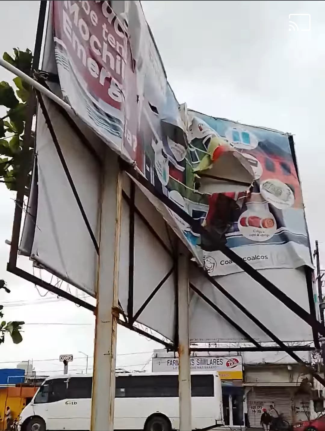 Norte deja láminas y espectaculares desprendidos, y autos atascados en Coatzacoalcos