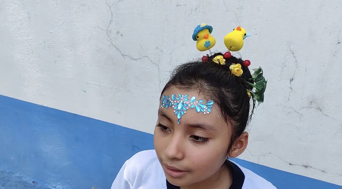 Otra estudiante llevó en su cabeza un nido de pollitos, que junto con su mamá lo elaboraron.