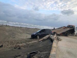 En el lugar, un automóvil Hyundai, tipo Grand i10, color negro, sin placas de circulación, abandonó la superficie de rodamiento cuando transitaba de oriente a poniente y terminó varios metros dentro de la playa, tras presuntamente perder el control del volante su conductor.