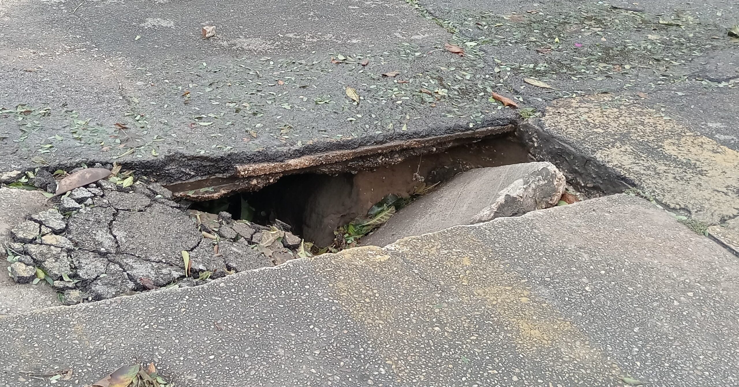 El hundimiento, ubicado justo en el borde de una losa de concreto, ha dejado un hueco de profundidad considerable que deja expuesta la falta de soporte en el subsuelo.
