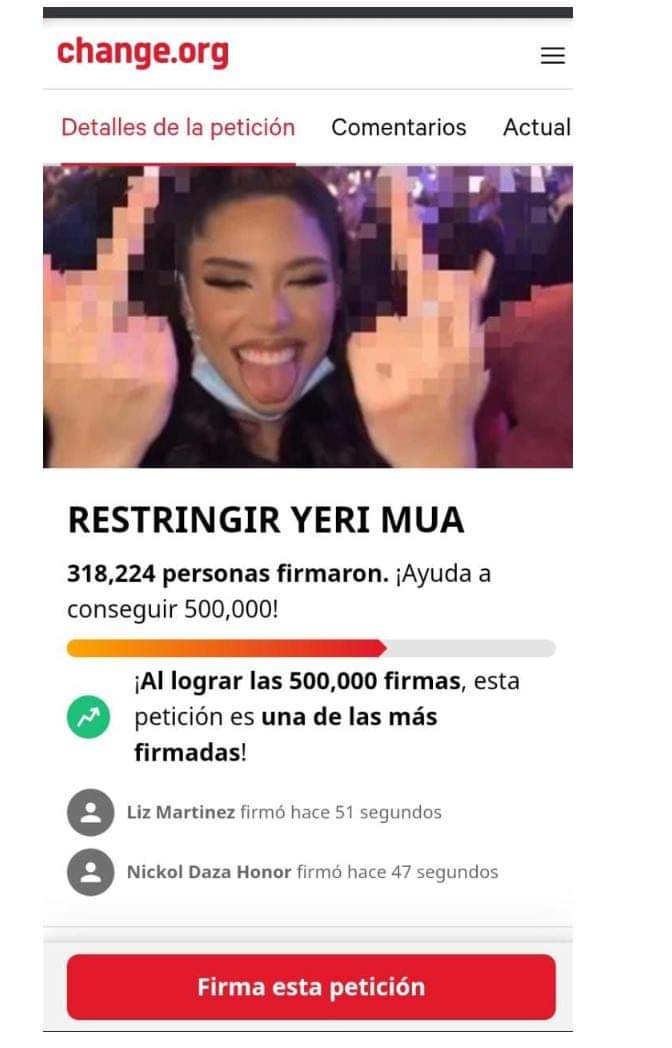 La petición realizada por una usuaria en http://change.org para restringir a la influencer Yeri MUA de las redes sociales, suma ya 318,206 firmas y la cifra sigue aumentando.