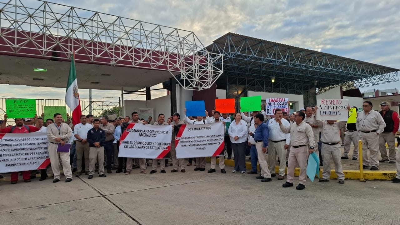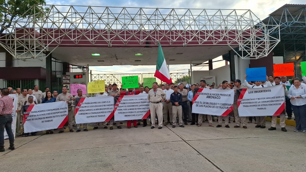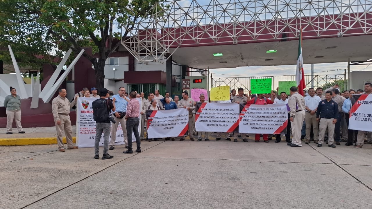 La mañana de este martes trabajadores petroleros se manifestaron afuera de las instalaciones del Complejo Petroquímico Cosoleacaque, para exigir el desplazamiento de la mano de obra calificada a la que están incurriendo directivos del complejo.