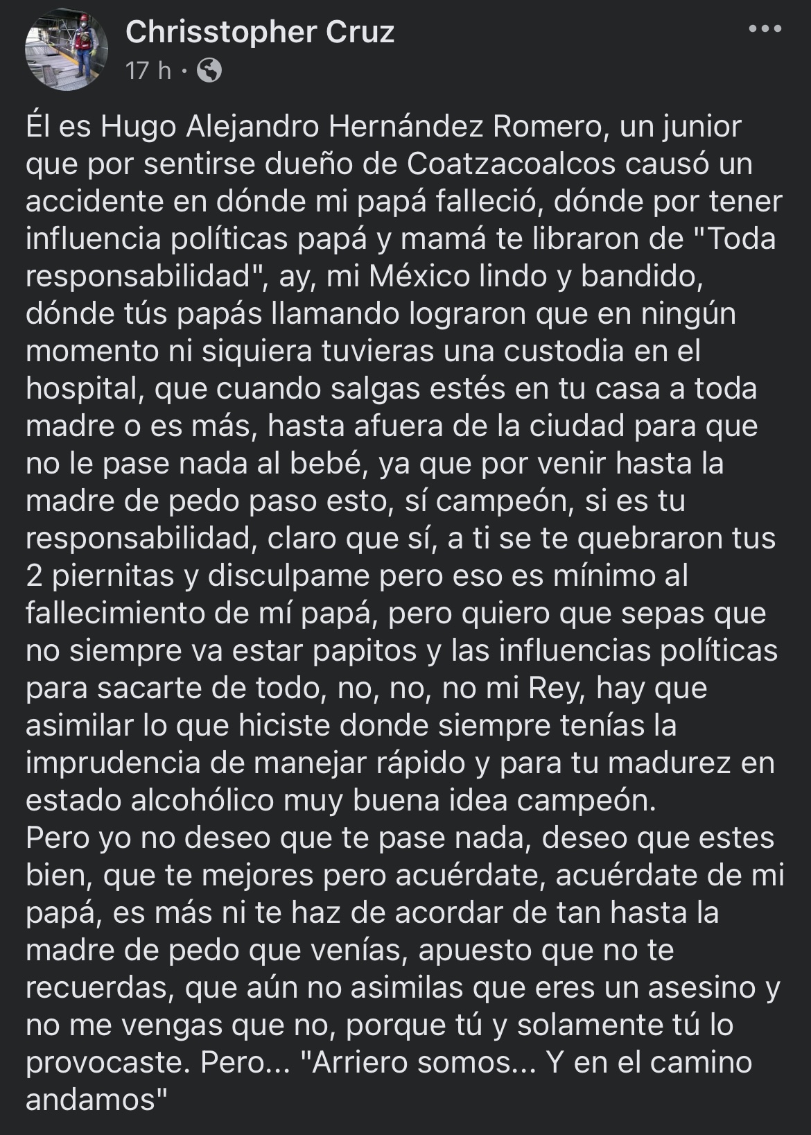 “Él es Hugo Alejandro Hernández Romero, un junior que por sentirse dueño de Coatzacoalcos causó un accidente en dónde mi papá falleció, dónde por tener influencia políticas papá y mamá te libraron de “toda responsabilidad”, ay, mi México lindo y bandido, dónde tús papás llamando lograron que en ningún momento ni siquiera tuvieras una custodia en el hospital, que cuando salgas estés en tu casa a toda madre o es más, hasta afuera de la ciudad para que no le pase nada al bebé, ya que por venir hasta la madre de pedo paso esto”, relató en su perfil.