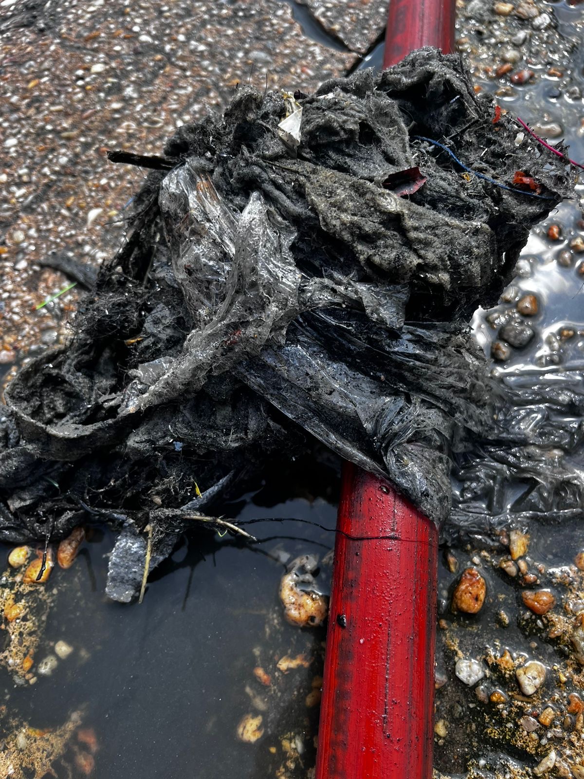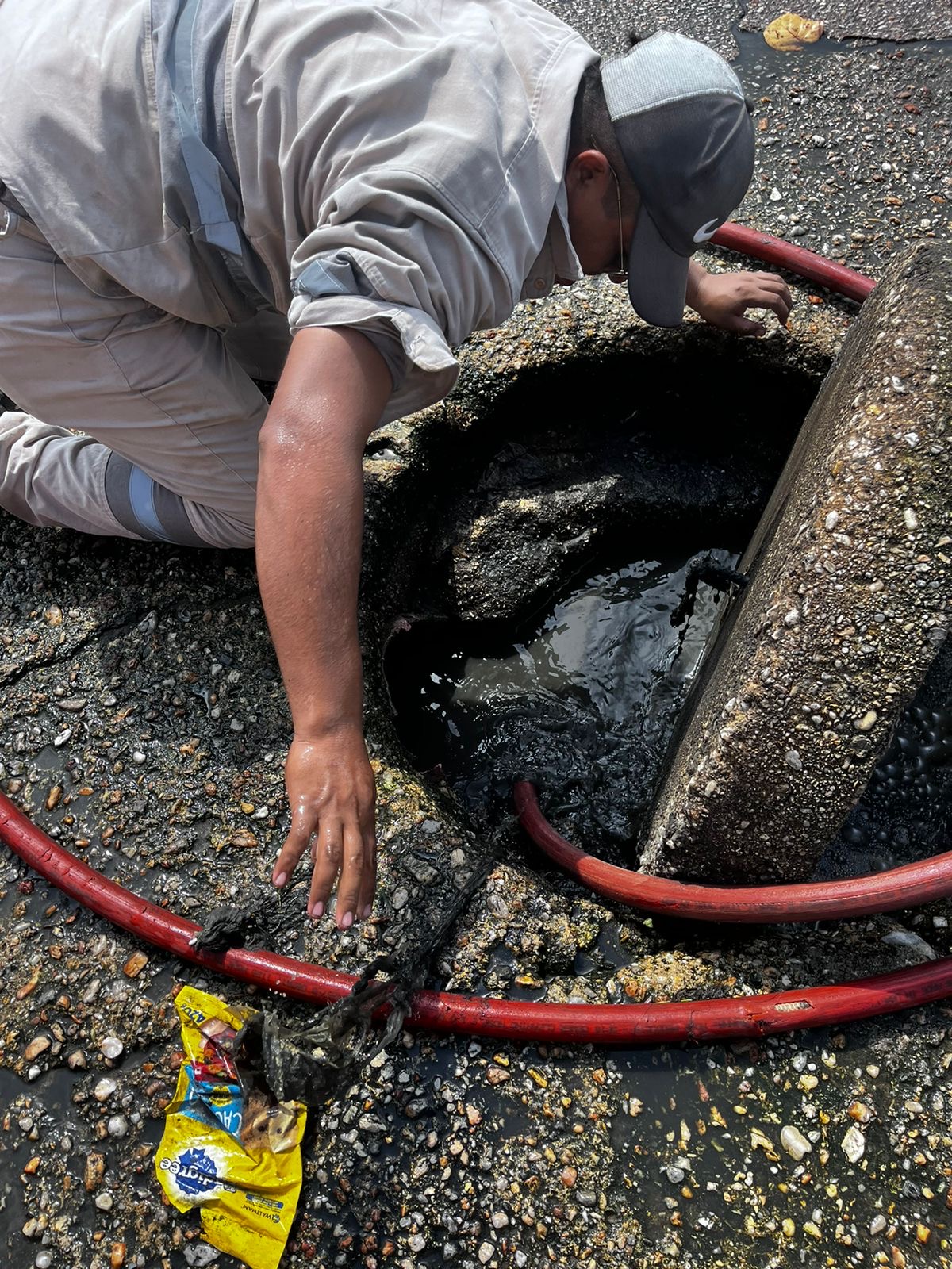Los pozos de visita en los que se llevó a cabo el trabajo de desazolve presentaban escurrimientos de aguas residuales debido a bloqueos causados por acumulación de diversos desechos, como bolsas y aceite de cocina con residuos sólidos de comida, los cuales formaron tapones impidiendo un correcto escurrimiento de las aguas.
