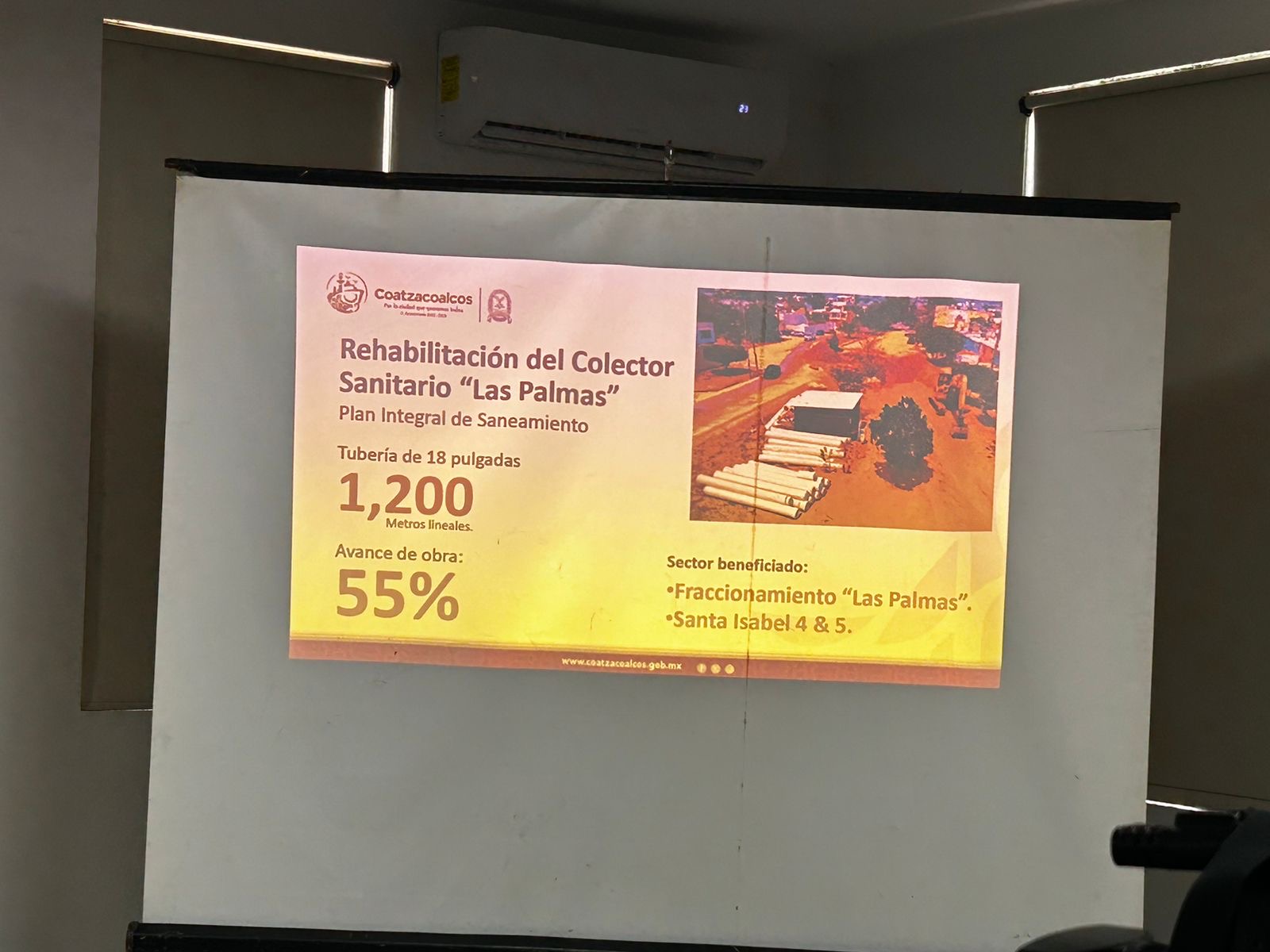 También se lleva acabo la rehabilitación del Colector Sanitario “Las Palmas” en el municipio de Coatzacoalcos. La obra incluye la instalación de una tubería de 18 pulgadas a lo largo de 1,200 metros.