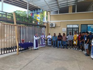 El Viacrucis se desarrolló en la casa de atención a migrantes, un espacio que desde hace años brinda ayuda humanitaria a personas en tránsito y que en otro tiempo también sirvió como refugio.