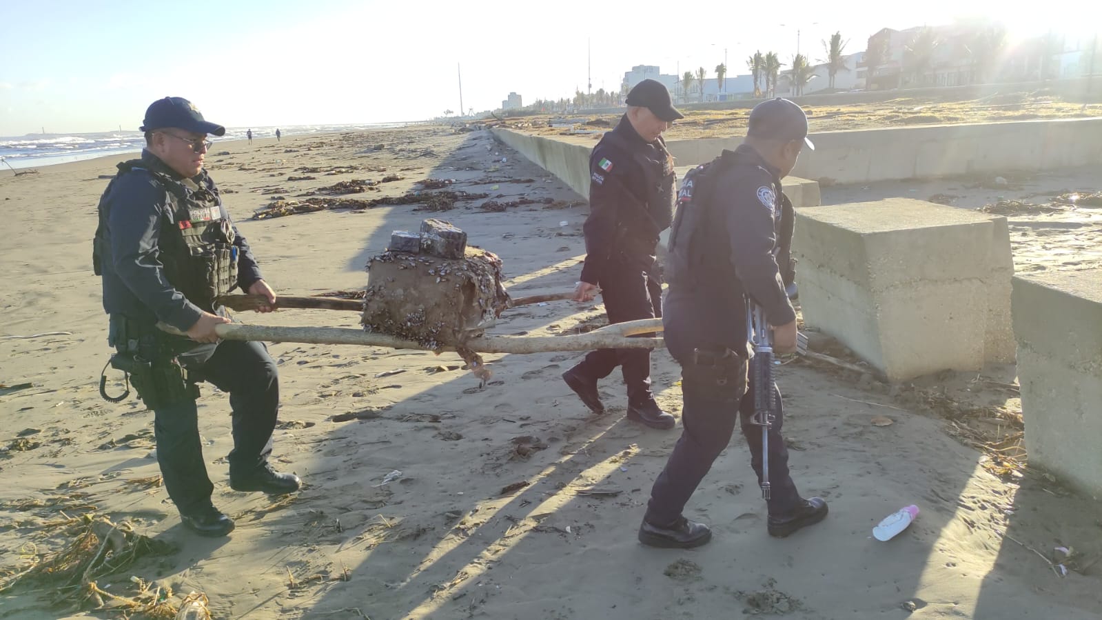 A ambos sitios llegaron elementos de la Secretaria de Seguridad Pública (SSP) para inspeccionar el bulto y procedieron a llevárselo a su base en el ex penal de Palma Sola.