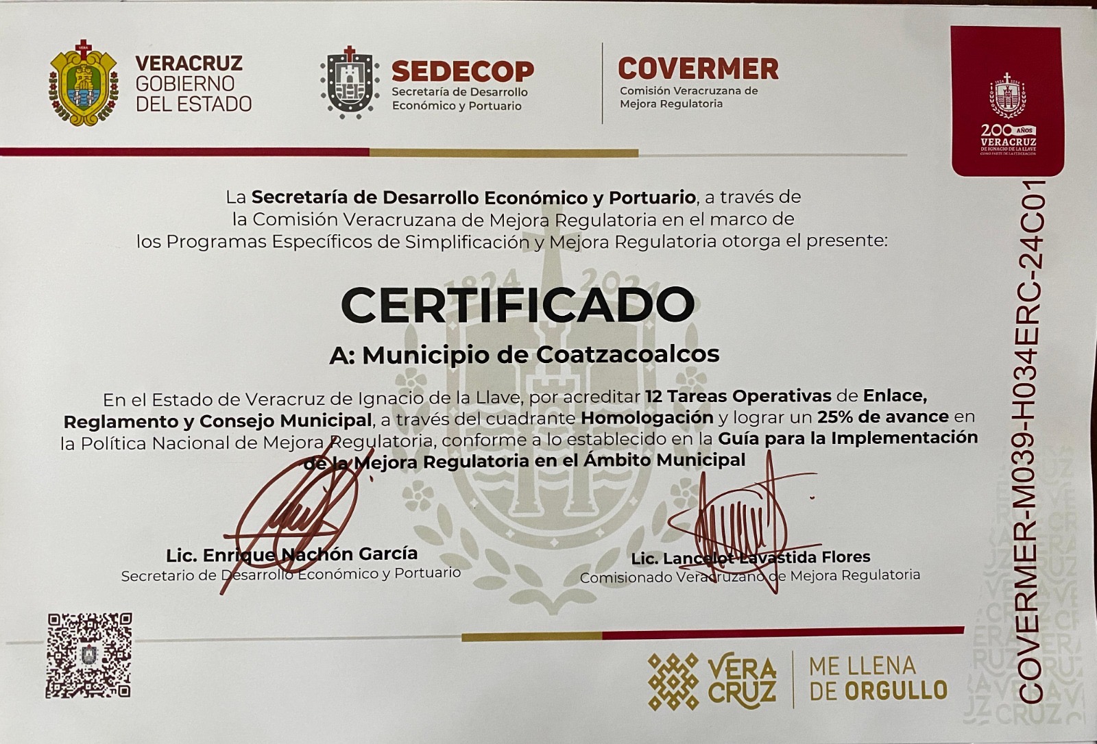 Durante la sesión, el munícipe recibió el Certificado del Programa de Especificación para la Simplificación y Mejora Regulatoria dirigido a dependencias, instituciones y ayuntamientos.