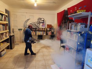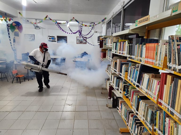 La fumigación incluye la nebulización y control de criaderos de mosquitos en interiores y exteriores de las bibliotecas, garantizando así entornos seguros y libres de criaderos para los asistentes y trabajadores.