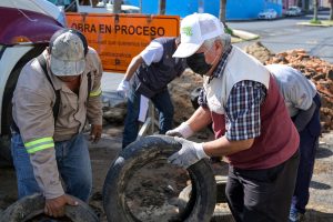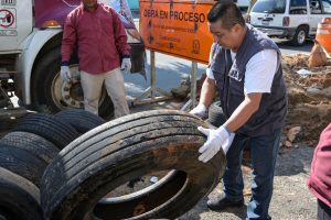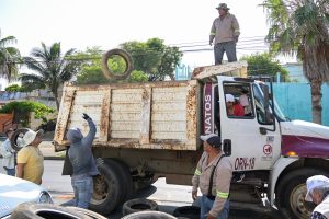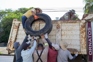 Este viernes, personal de la regiduría segunda, encabezada por la edil María Sandra Collins Coronel, en coordinación con las áreas de Limpia Pública, Ornatos y la Jurisdicción Sanitaria #11, llevó a cabo un recorrido por las principales avenidas de la colonia Benito Juárez Norte para recolectar llantas y cacharros que podrían convertirse en criaderos del mosquito transmisor del dengue.