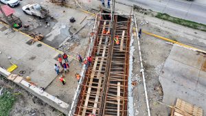 Previo a esta etapa, se llevaron a cabo trabajos de levantamiento topográfico, así como la demolición de losas de concreto armado y muro interior del canal, desazolve de la tubería de acero para el desvío del cauce pluvial, suministro y colocación de costales con arena para el debió de aguas.