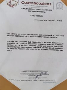 Coatzacoalcos, Ver. — A través de un oficio emitido este miércoles, el Ayuntamiento de Coatzacoalcos, por medio del área de Tesorería Municipal, envió un aviso urgente dirigido a los comerciantes que operan con remolques sobre el malecón costero.