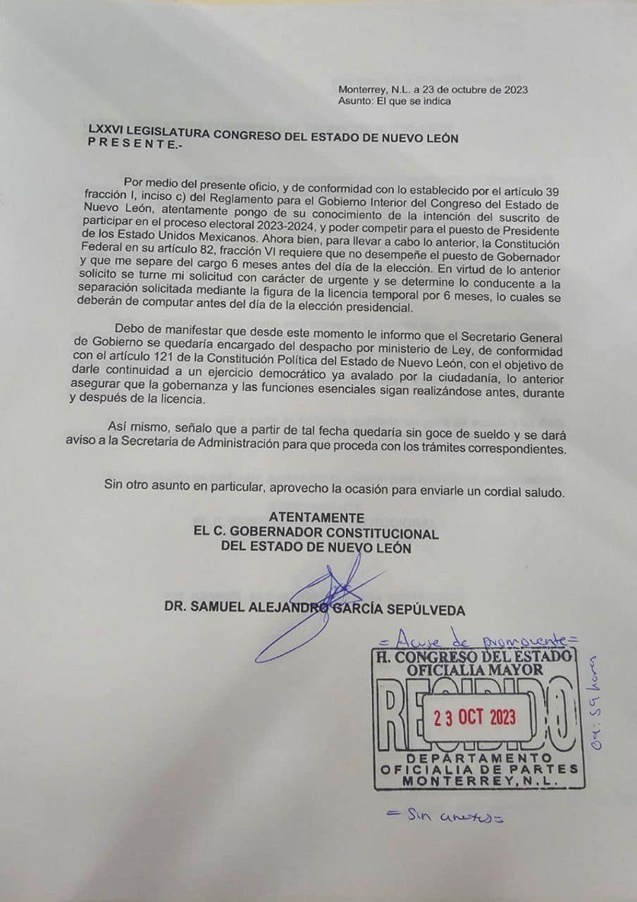 El gobernador de Nuevo León, Samuel García Sepúlveda, a través de la Consejería Jurídica, solicitó hoy en carácter de urgente al Congreso del Estado la aprobación de la licencia por seis meses para separarse del cargo y contender como candidato de MC a la presidencia de México en las elecciones del 2024, al tiempo que dejó a Javier Navarro como encargado de Despacho del Ejecutivo.