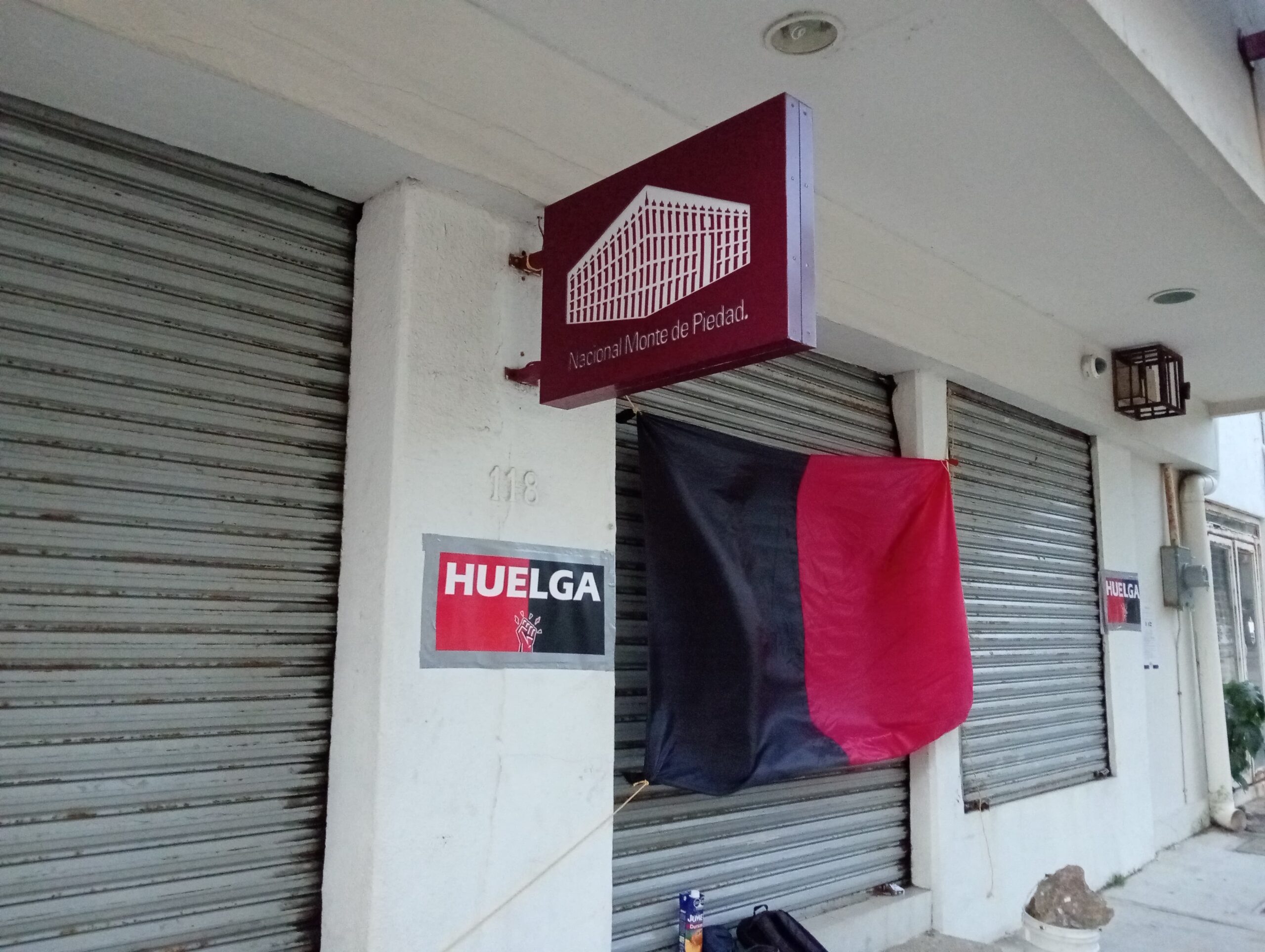 Se cumplieron más de 24 horas del estallamiento de la huelga de los trabajadores del sindicato nacional del Monte de Piedad; en Coatzacoalcos 20 empleados de dos sucursales se sumaron a la protesta y colgaron la bandera rojinegra.