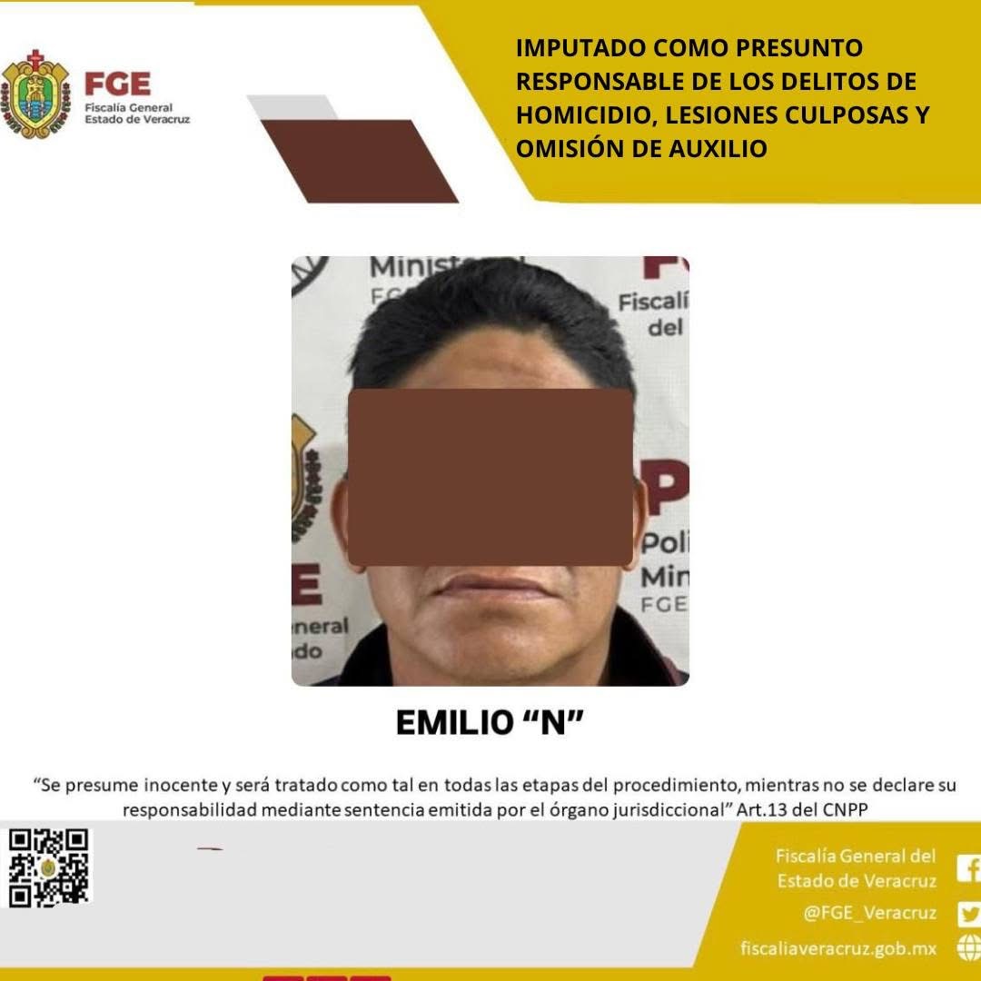 La Fiscalía General del Estado, informa que, la Fiscalía Regional Veracruz realizó imputación en contra de Emilio “N” como probable responsable de los delitos de homicidio cometido en agravio de la víctima A.H.R., lesiones culposas y omisión de auxilio en agravio de las personas lesionadas.