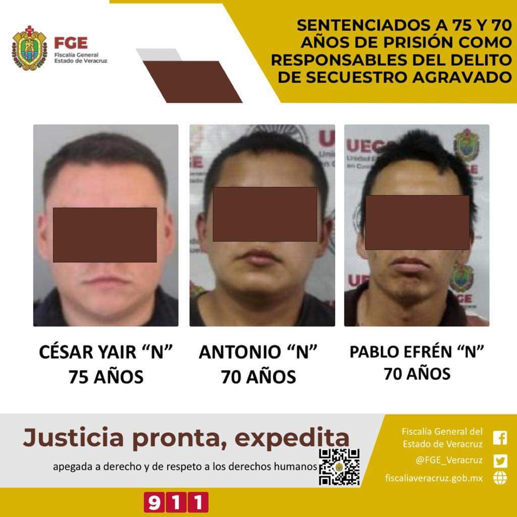 La Unidad Especializada en Combate al Secuestro logró sentencias condenatorias de 70 años de prisión en contra de Pablo Efrén “N” y Antonio “N” y de 75 años de prisión en contra de César Yair “N” como responsables del delito de secuestro agravado en agravio de la víctima identificada con las iniciales S.C.C.