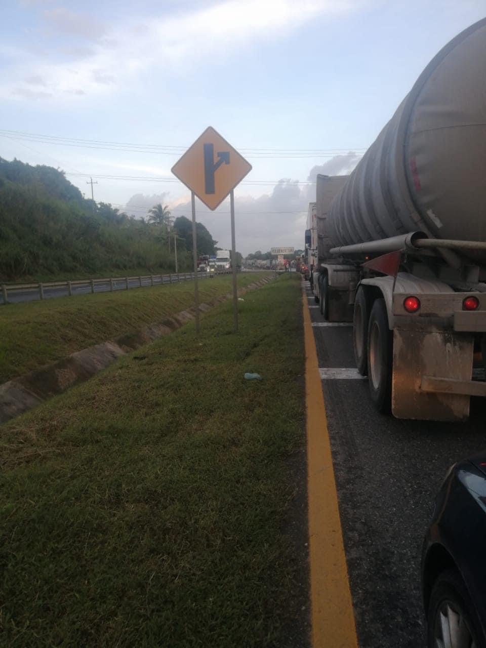Esta mañana, el tramo de Villahermosa hacia Coatzacoalcos luce con un gran congestionamiento de vehículos.