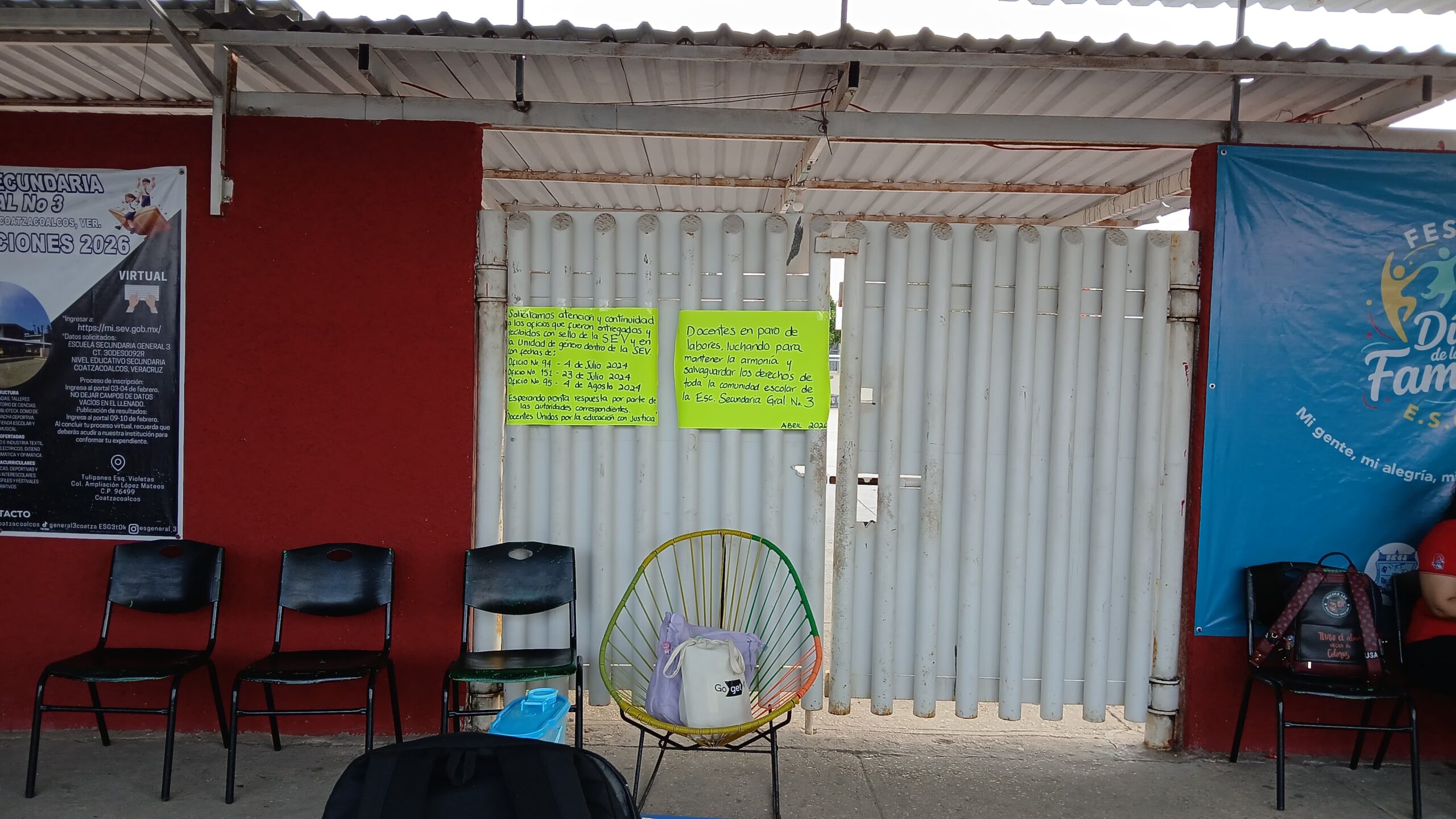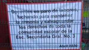 “Docentes en paro de labores, luchando para mantener la armonía y salvaguardar los derechos de toda la comunidad escolar de la Esc. Secundaria Gral. No. 3”, establece una de las lonas.