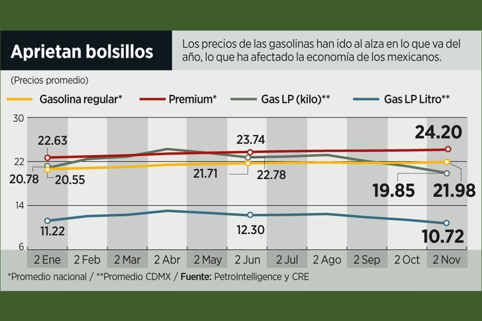Tan solo la gasolina regular registró un precio promedio de 20.60 pesos por litro en enero y actualmente ronda los 21.98 pesos.
