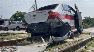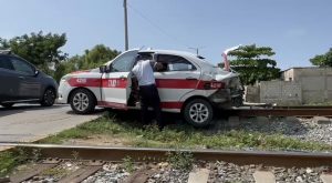 Un taxi fue arrastrado por el tren de pasajeros del Ferrocarril del Istmo de Tehuantepec (FIT) cuando intentó ganarle el paso sobre las vías férreas a la altura de la colonia Santa Rosa al poniente de Coatzacoalcos.