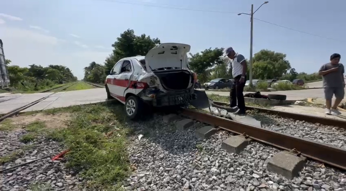 Un taxi fue arrastrado por el tren de pasajeros del Ferrocarril del Istmo de Tehuantepec (FIT) cuando intentó ganarle el paso sobre las vías férreas a la altura de la colonia Santa Rosa al poniente de Coatzacoalcos.