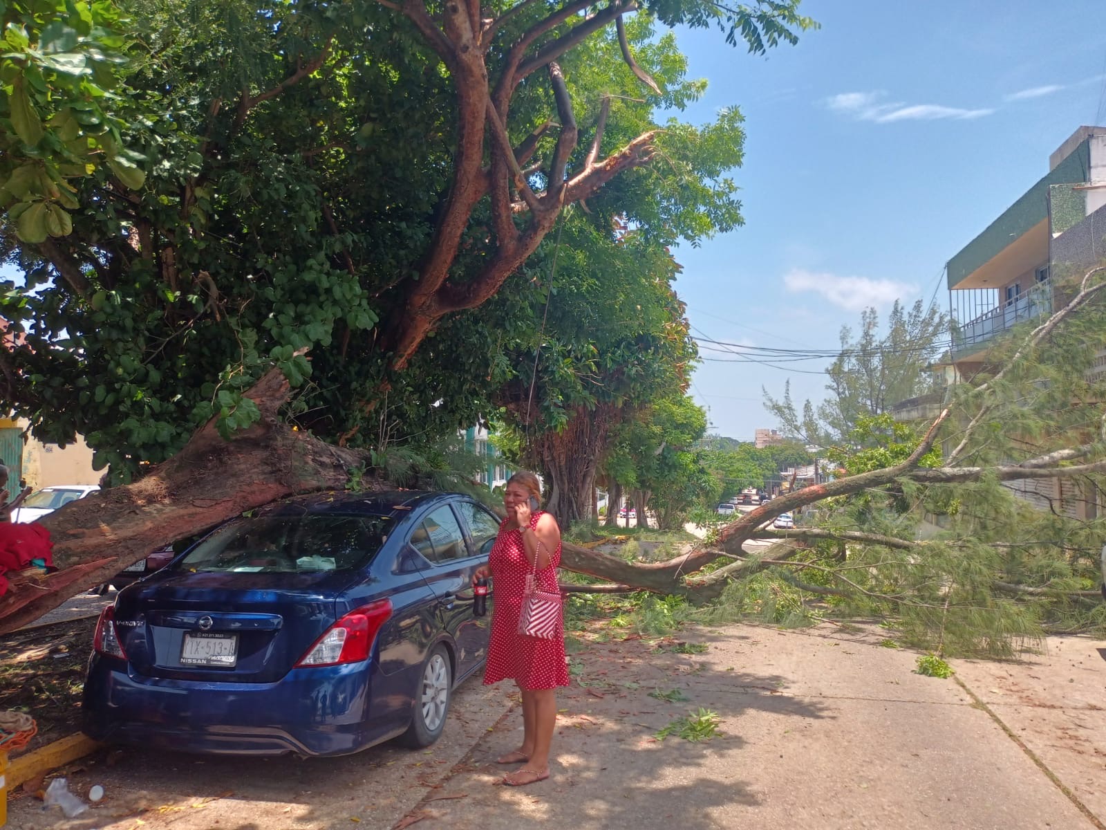 Las ramas y el grueso tronco de un árbol de pino aplastaron a un auto en el centro de Coatzacoalcos, tras el paso de un tractocamión que reventó cables de energía eléctrica y de telefonía.