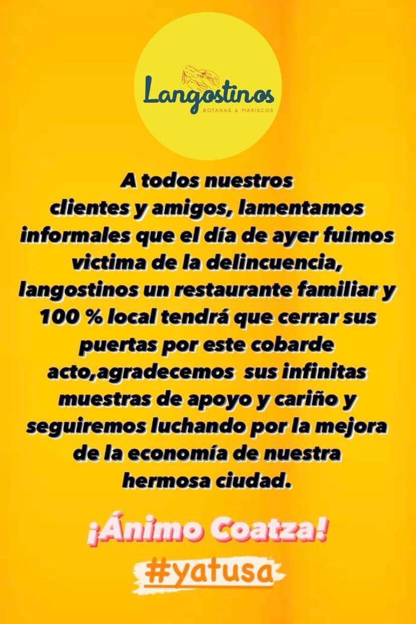 Con profundo pesar, queremos informarles que ayer fuimos víctimas de un acto de delincuencia. Langostinos, un restaurante familiar y 100% local, se ve forzado a cerrar sus puertas debido a este cobarde acto.