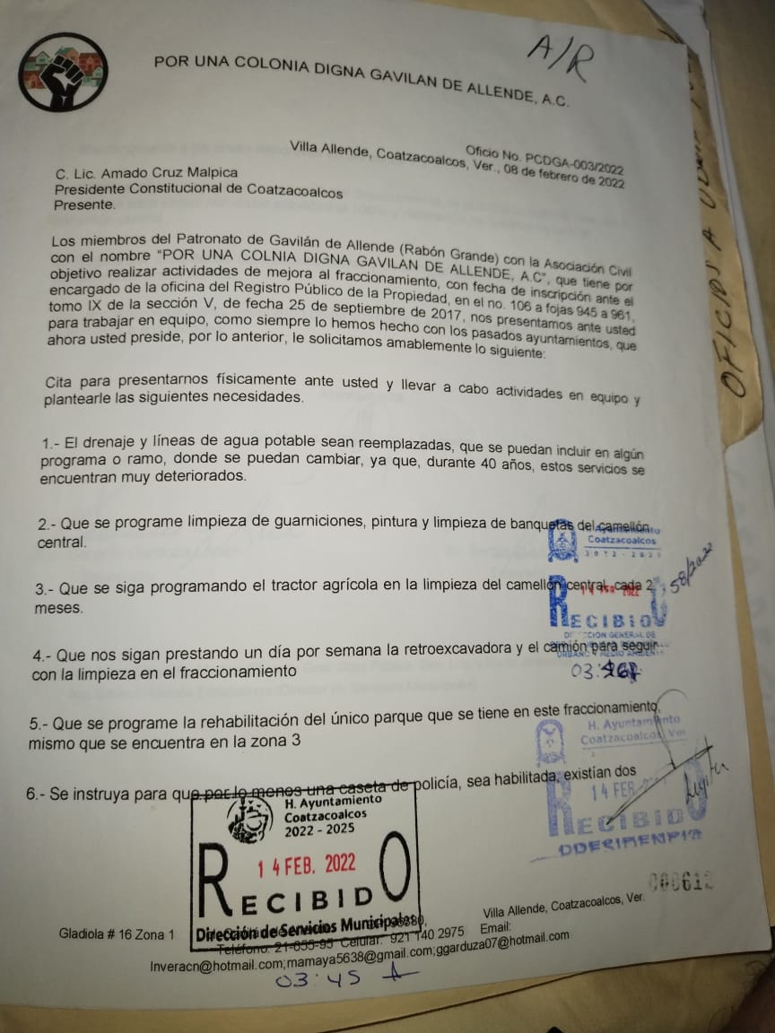 “Tiene más de un año solicitándole al alcalde y director de Obras Públicas varios servicios para el fraccionamiento, con un programa de limpieza de camellón central, así empieza la odisea con los diferentes oficios con fecha de recibido el día 14 de febrero del año 2022 “, resaltaron.