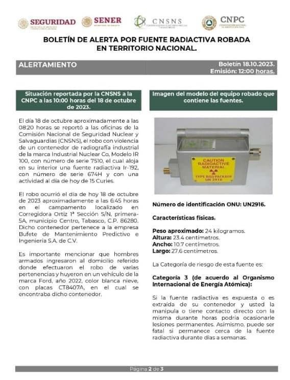 Esta fuente de radiación fue robada la mañana de hoy 18 de octubre en Tabasco de un inmueble ubicado en Corregidora Ortiz 1a. Sección, en el municipio de Centro, Tabasco.