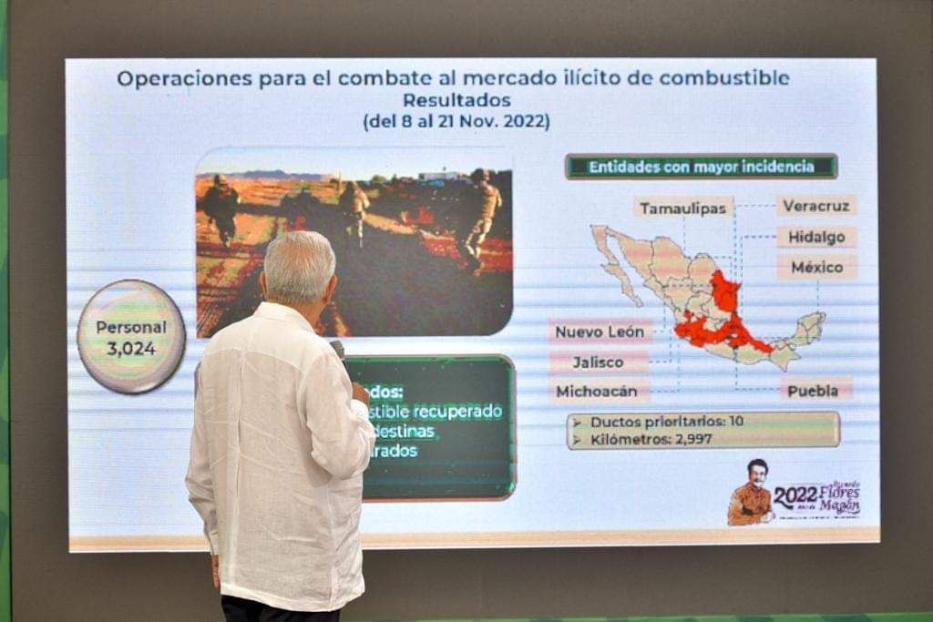 En materia de combate a la delincuencia, el Almirante destacó el aseguramiento de mil 413 kilos de marihuana, 427 de cocaína y 4 de metanfetamina; 2 mil 963 vehículos, una aeronave y 2 mil 636 metros cúbicos de madera; 316 armas de fuego, 15 mil 841 cartuchos, 666 cargadores y 31 granadas; además de 53.6 millones de litros de combustible, 18.4 millones de pesos y 695 mil dólares, con la detención de 3 mil 809 personas.