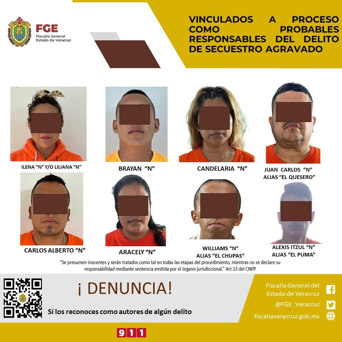 La Fiscalía Regional Coatzacoalcos obtuvo vinculación a proceso en contra de Alexis Itzul “N” alias “El Puma”, Williams “N” alias “El Chupas”, Juan Carlos “N”, alias “El Quesero”, Brayan “N”, Ilena “N” y/o Liliana “N”, Aracely “N”, Candelaria “N” y Carlos Alberto “N” como probables responsables del delito de secuestro agravado cometido en agravio de la víctima con identidad resguardada.