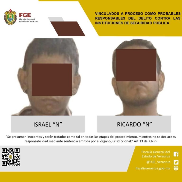 La Fiscalía Regional Coatzacoalcos obtuvo vinculación a proceso en contra de Israel “N” y Ricardo “N” como probables responsables del delito contra las instituciones de seguridad pública.