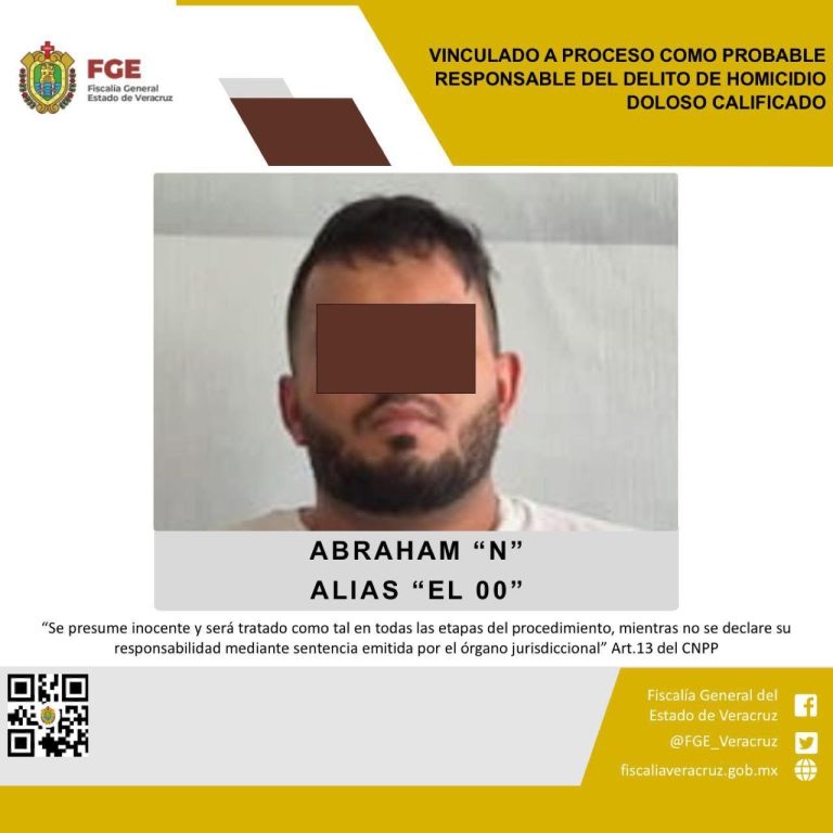 La Fiscalía General del Estado informa que, la Fiscalía Regional Coatzacoalcos obtuvo vinculación a proceso en contra de Abraham “N”, alias “00”, considerado un objetivo prioritario en la zona Sur del Estado, como probable responsable del delito de homicidio doloso calificado en agravio de la víctima identificada con las iniciales C.A.P.R.