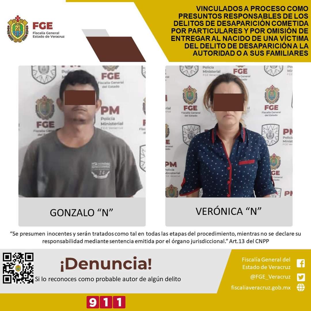 La Fiscalía General del Estado, encabezada por Verónica Hernández Giadáns a través de la Fiscalía Especializada para la Atención de Denuncias por Personas Desaparecidas obtuvo vinculación a proceso en contra de Gonzalo “N” y Verónica “N” como presuntos responsables del delito de desaparición cometida por particulares agravado por su condición de embarazo, en agravio de Rosa Isela Castro Vázquez, y por el delito cometido en agravio de la recién nacida por la omisión de entregar al nacido de una víctima del delito de desaparición a la autoridad o a sus familiares, hechos suscitados el pasado 30 de noviembre del presente año, en el municipio de Medellín de Bravo.