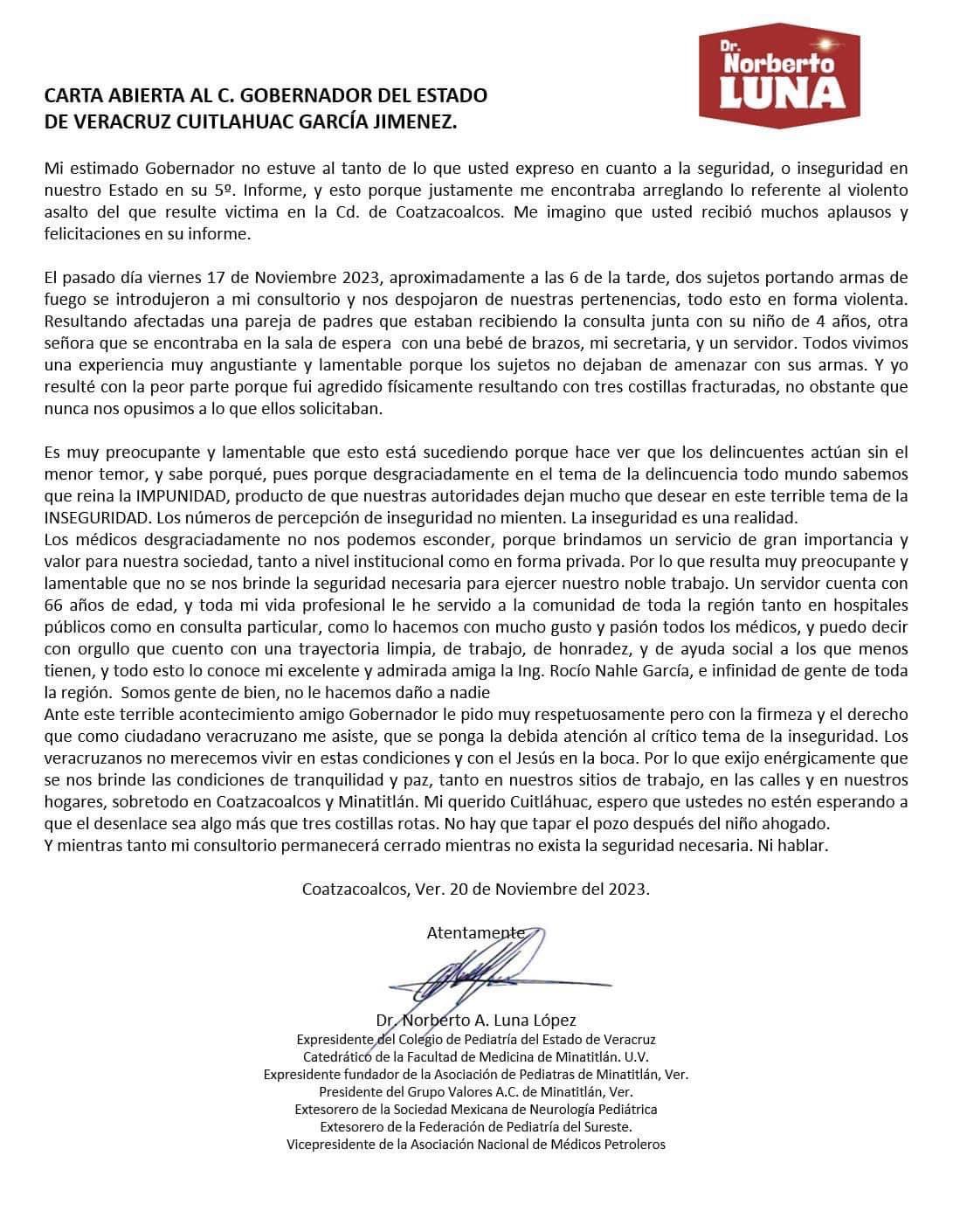 En un carta abierta dirigida al Gobernador del Estado de Veracruz, Cuitláhuac García Jiménez, Luna López, evidenció la falta de seguridad para los profesionales de la salud, y de cualquier ciudadano.