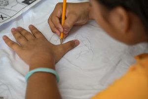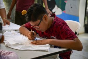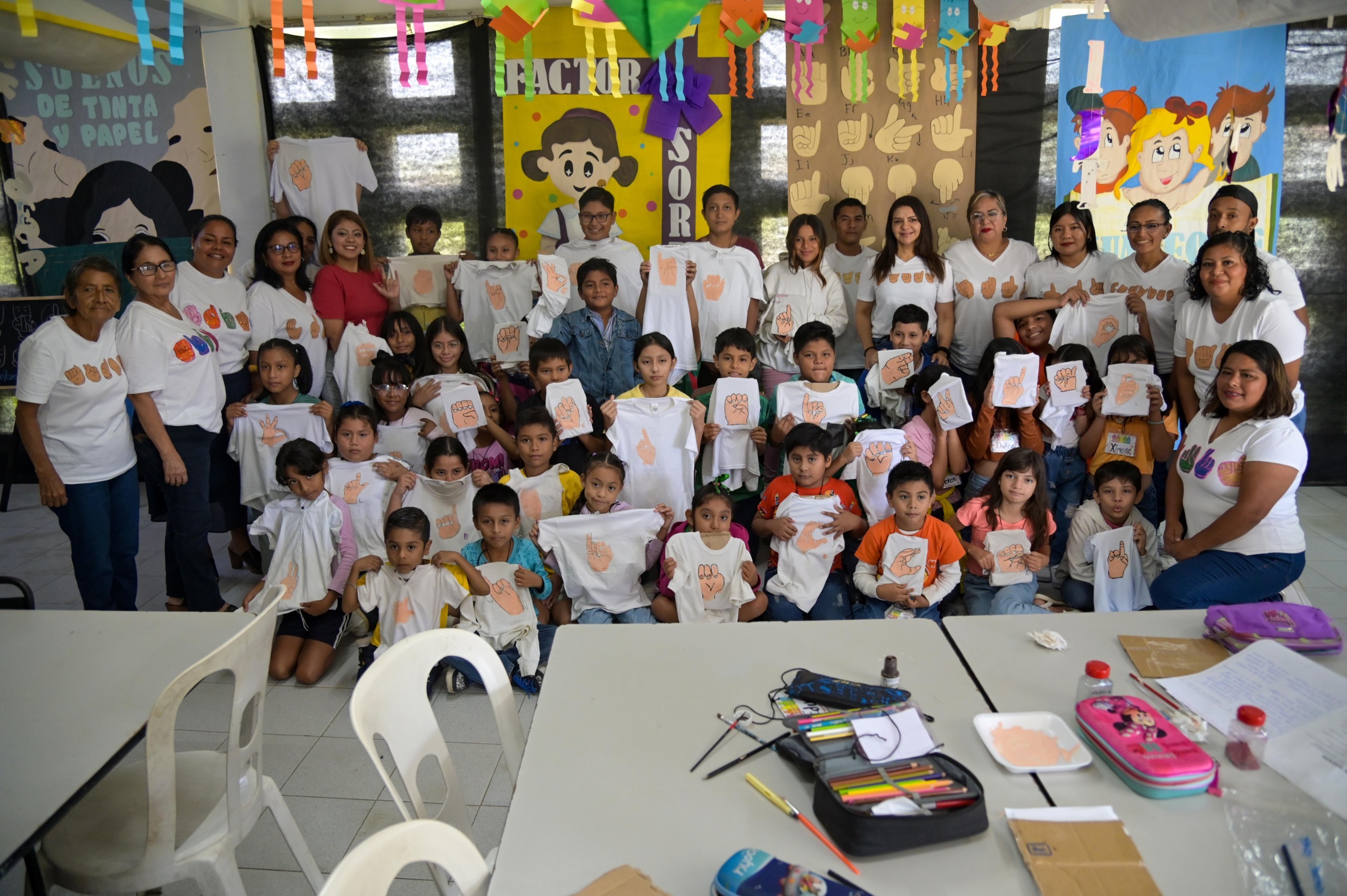 A través de videos, los participantes fueron concientizados sobre la importancia de la inclusión y como actividad práctica, cada niño pintó una playera con la inicial de su nombre en lenguaje de señas.