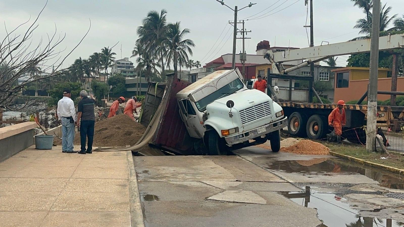 Aparatoso accidente se registró en el malecón antiguo de Coatzacoalcos, donde un volteo quedó volcado cuando transportaba arena, sin que se reportaran personas lesionadas.